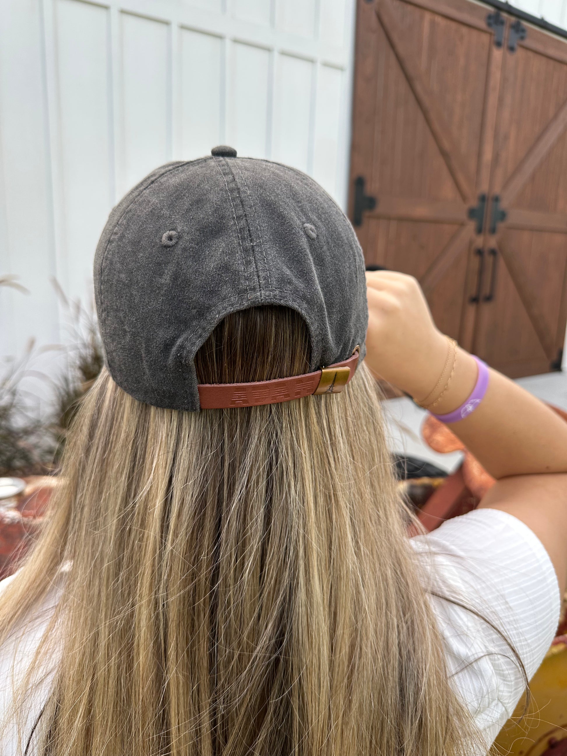 The colors labeled Pink, Aruba Blue and Charcoal black all have a brown leather strap in back. See picture.